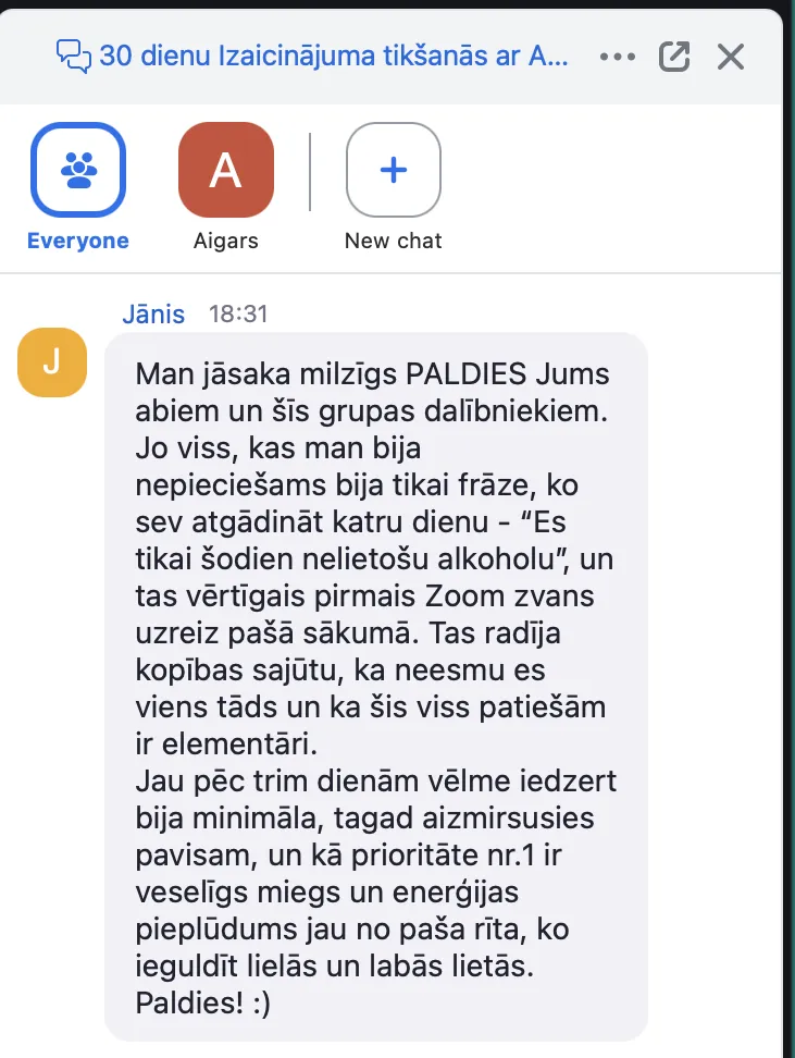 “Tu vairs necīnies ar alkoholu — tu dzīvo brīvībā no tā.”
